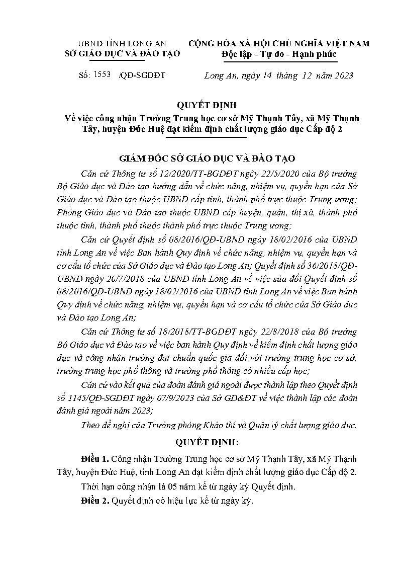 Trường THCS Mỹ Thạnh Tây đạt kiểmk định chất lượng giáo dục mức độ 2.